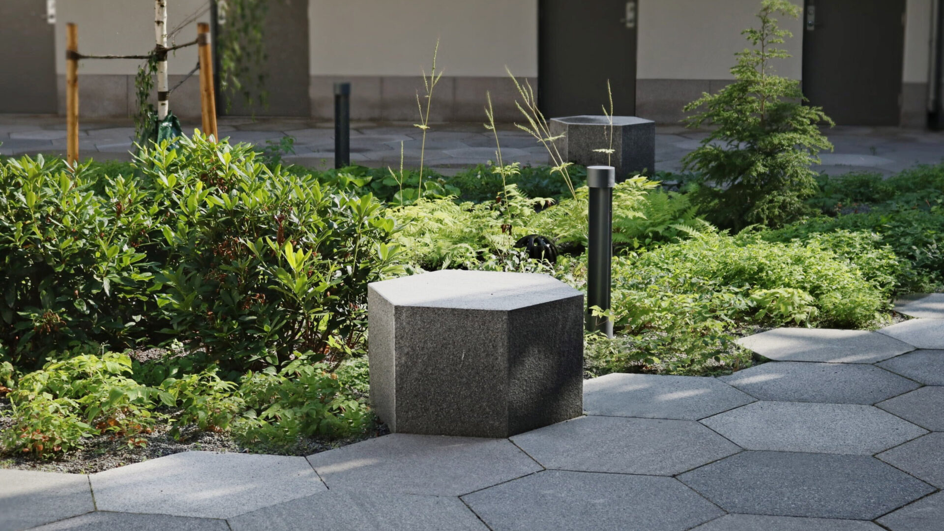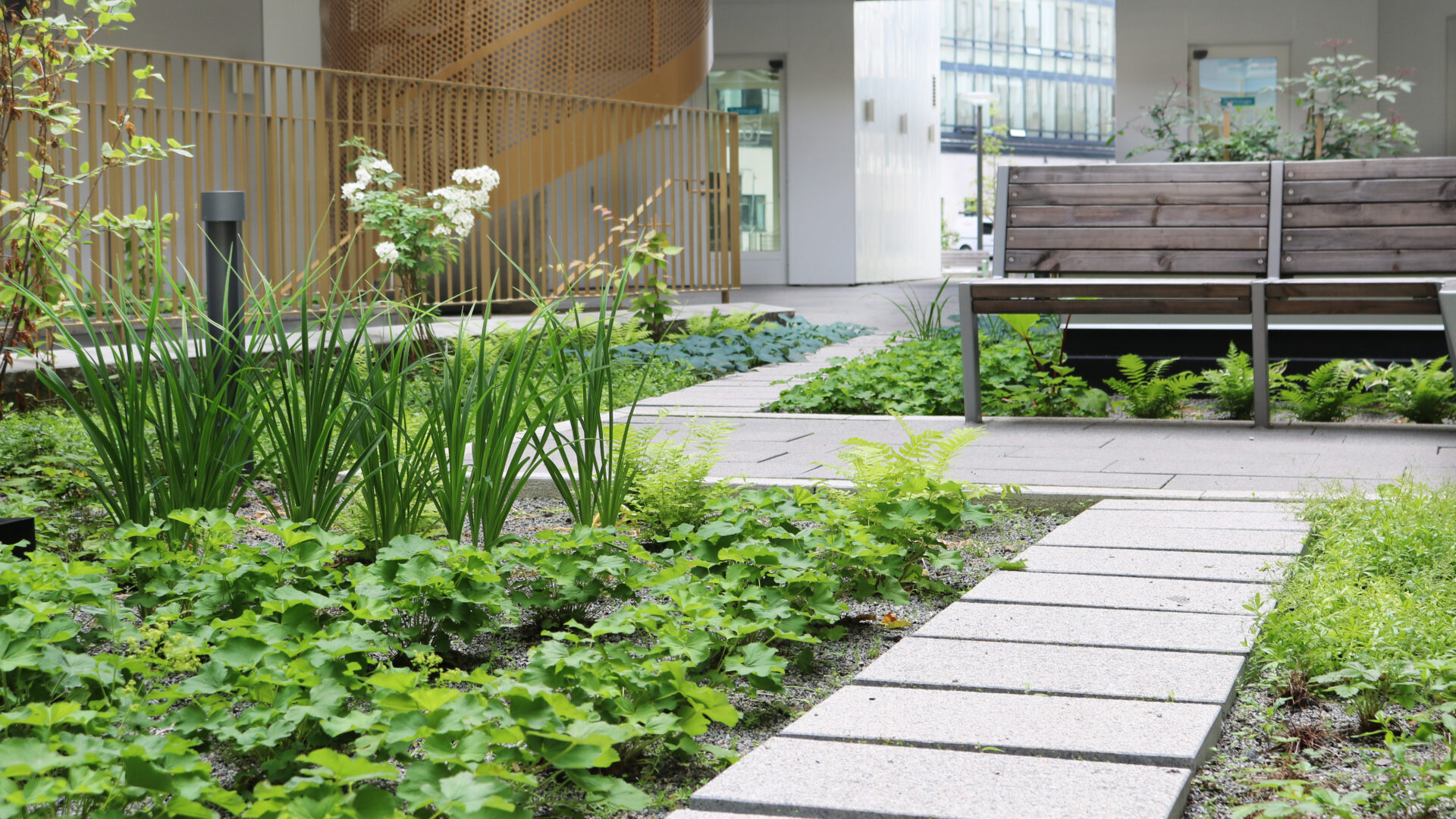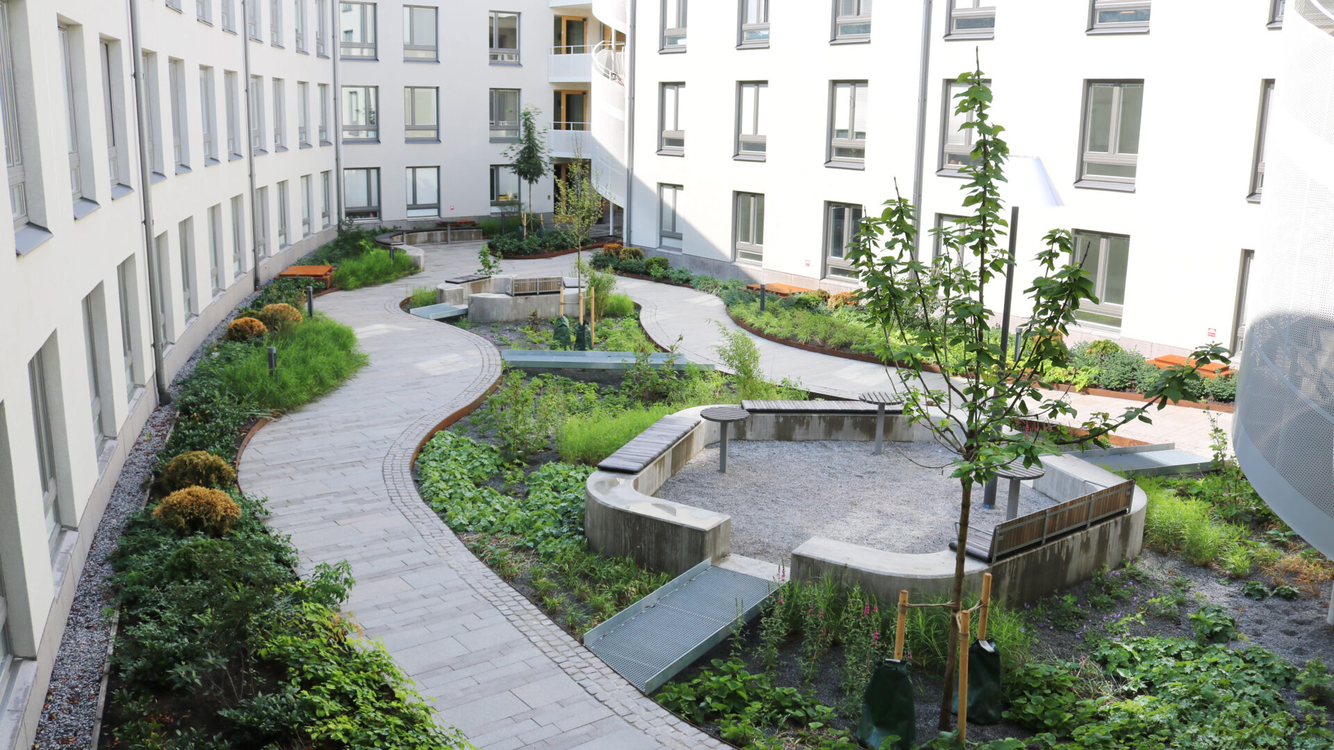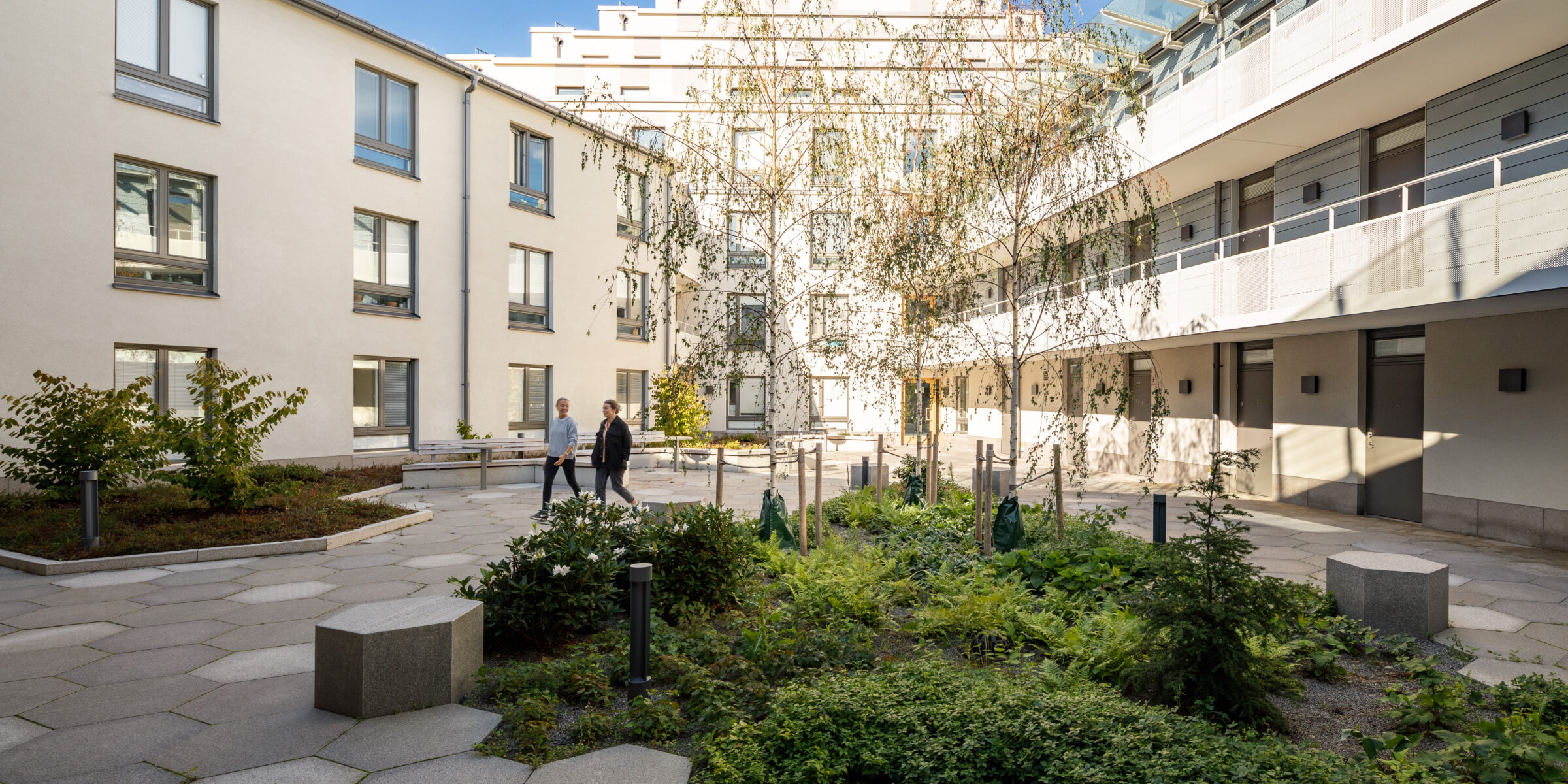 För att gårdarna ska tåla tidens tand har vi konsekvent arbetat med en palett av nordiska graniter. Taken har vi klätt med grönska som fungerar som spridningsvägar för insekter och fåglar. Det är lösningar som gör Albano till en resilient stadsdel där det tekniska underarbetet lägger grunden för en levande utemiljö.