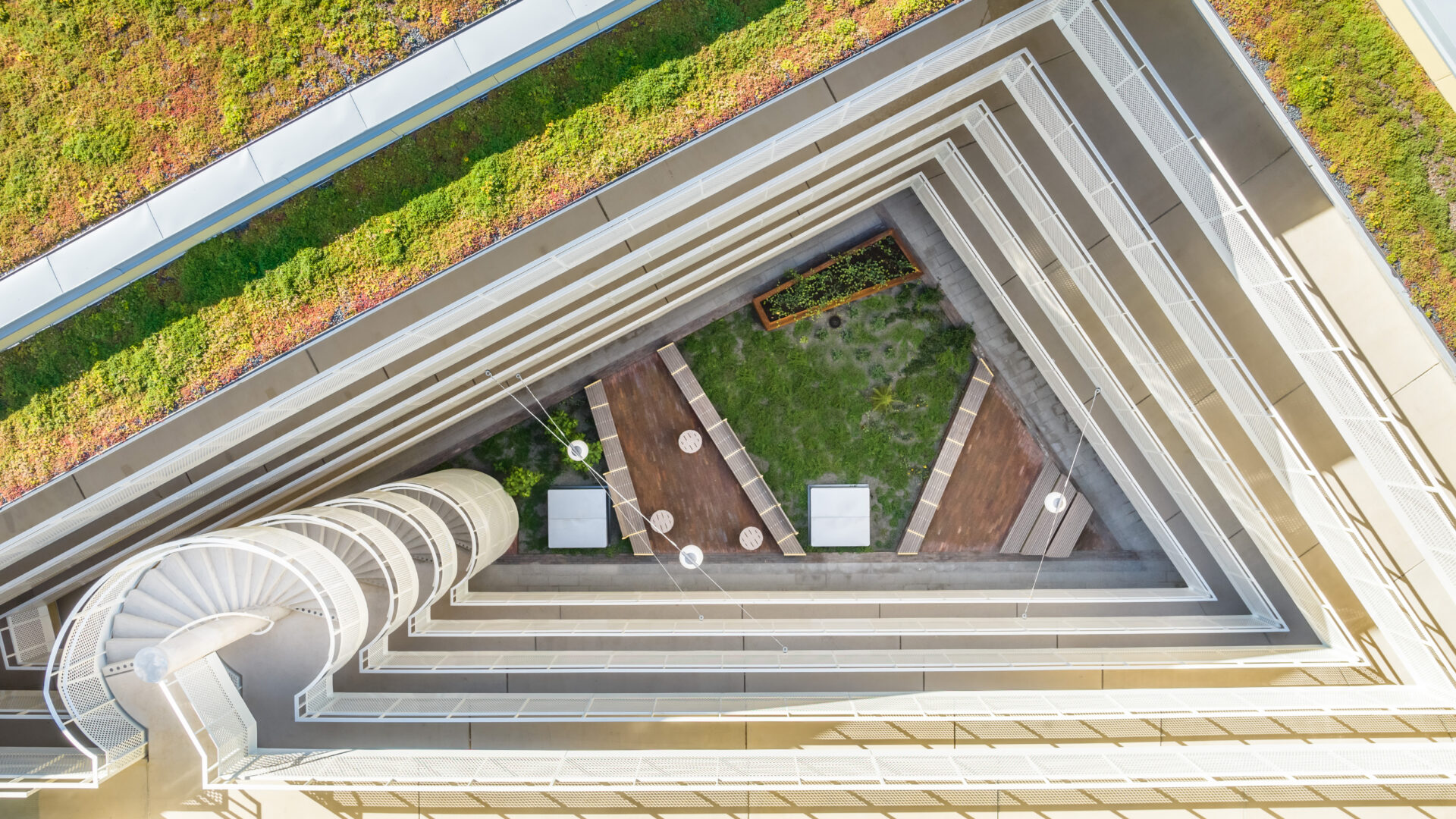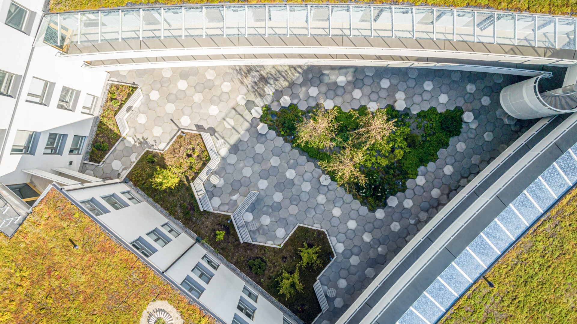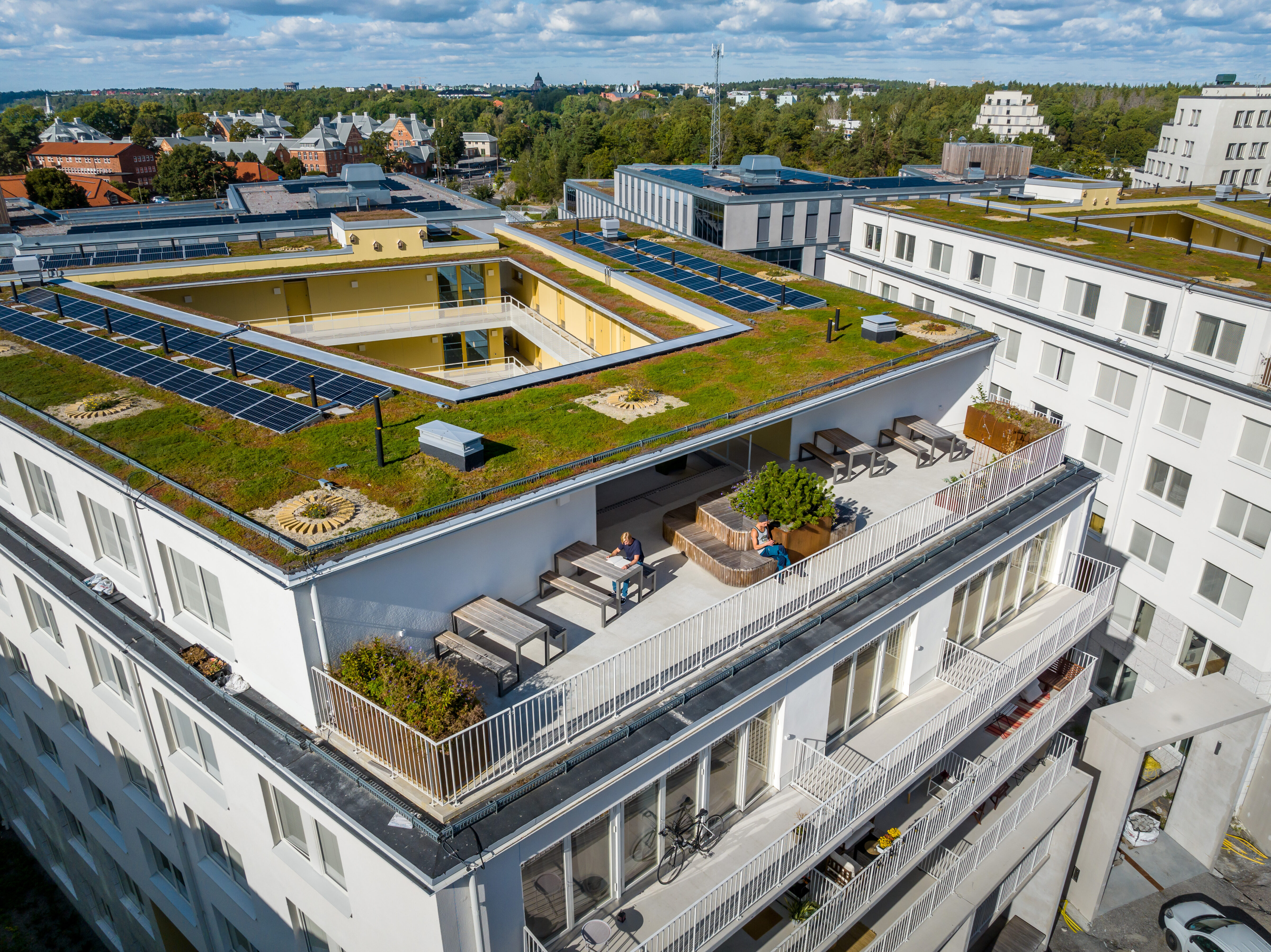 Husen har grönskande takterrasser med utsikt över Albanoparken och nationalstadsparken. Likt gårdarna ges terrasserna olika typer av formspråk och växtval för att komplettera varandra.