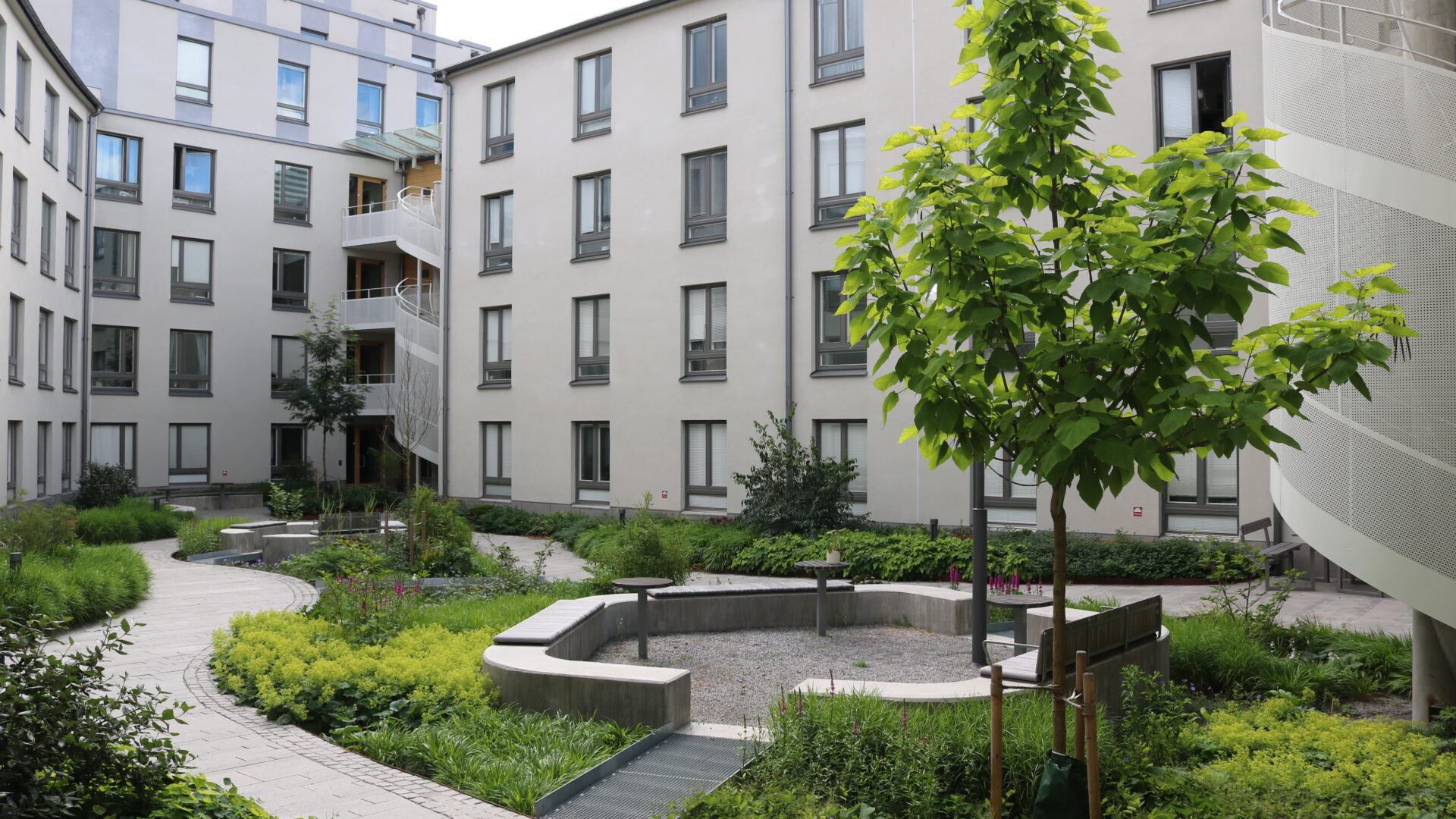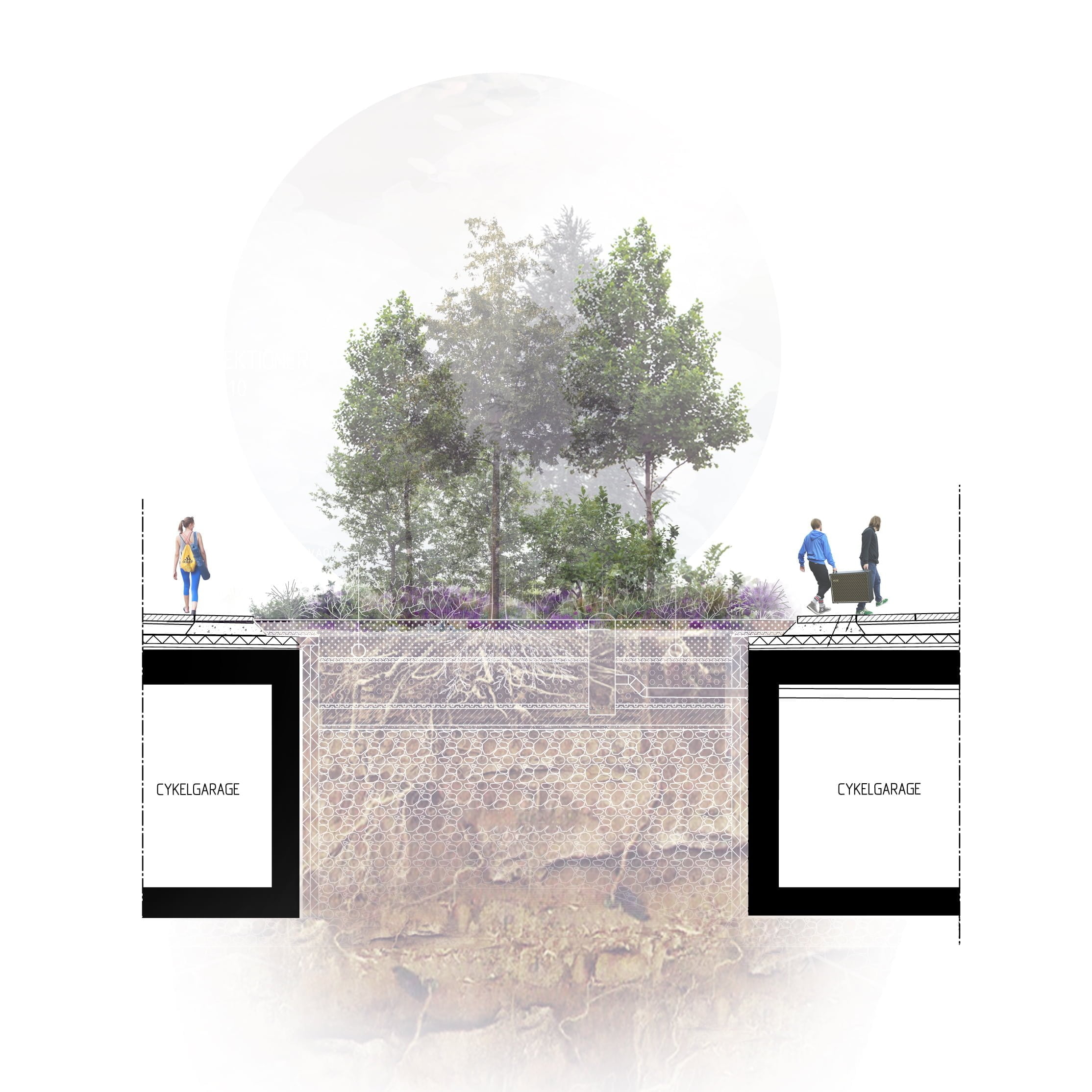 En av de största utmaningarna var att få stora träd och rik grönska att växa på bjälklag med begränsat djup. Vi löste det genom att arbeta med trädgropar som går igenom garagebjälklaget så att trädens rötter får kontakt med marken under garaget. Dessa gropar fungerar även som infiltrationsytor som tar hand om regnvattnet lokalt innan det leds vidare till ett gemensamt magasin.
