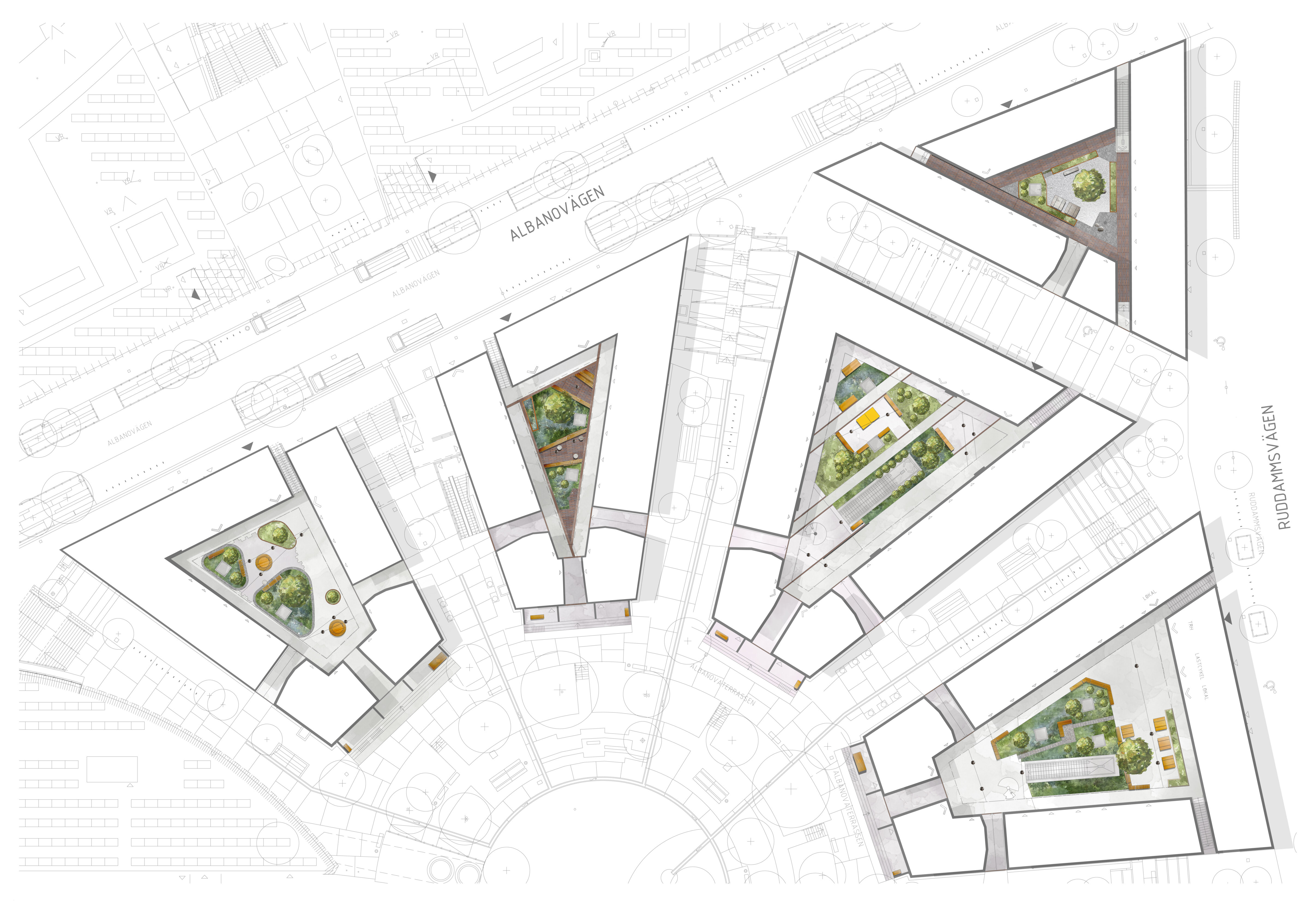 Vid Albano har vi skapat sju gårdar samverkar för att bilda en funktionell helhet. Innergårdarna och takterrasserna vid Campus Albano har fått distinkta karaktärer där gestaltningen svarar mot höga hållbarhetsambitioner. Utmaningen låg i att rita frodiga, levande miljöer ovanpå byggnadernas bjälklag och skapa platser där både studenter och lokalt djurliv kan trivas sida vid sida.