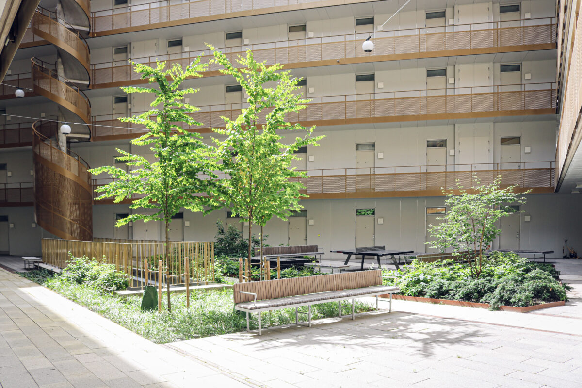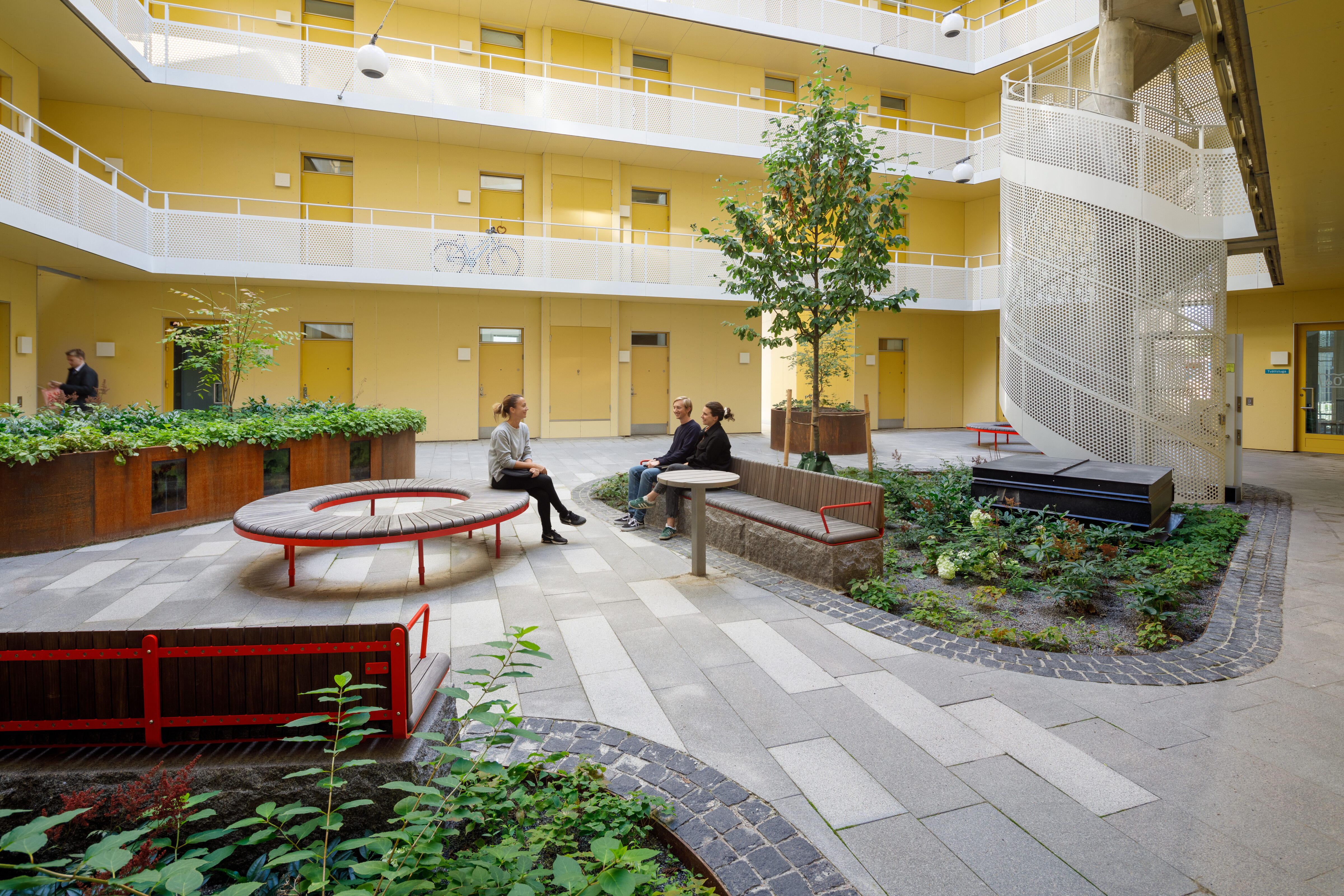 För att varje gård skulle få en egen identitet har vi gett de sju gårdarna varsin spektralfärg och namn, dvs ledord som Balans, Harmoni och Förnyelse som användes som inspiration för gestaltningen. Det handlar inte bara om estetik, utan om att skapa orienterbarhet och en känsla av hemma för de boende. Gårdarna är ritade för olika behov; här finns stora ytor för socialt häng och diskussioner, men också lugnare hörn för studier och vila.