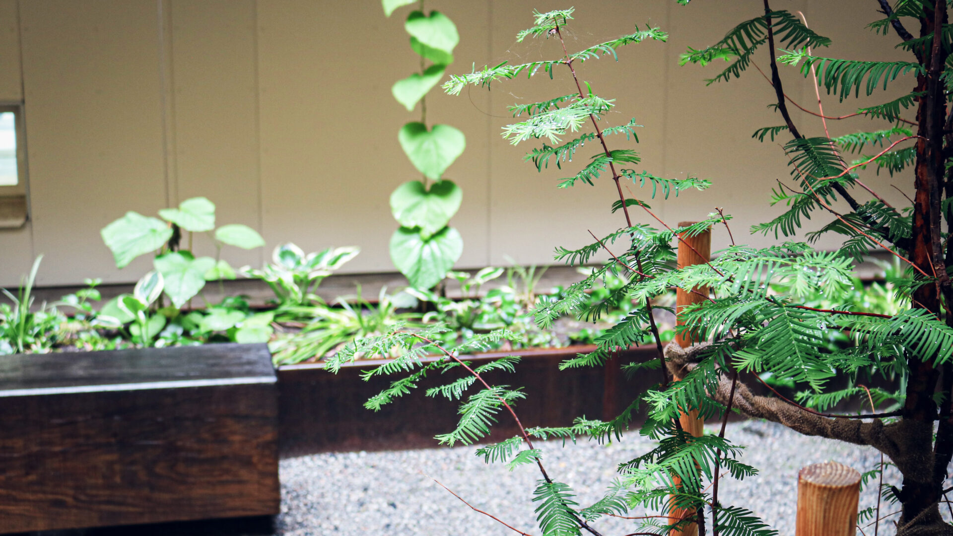 Växterna kan föra tankarna till en japansk trädgård med växter i gyllene toner av katsuror, kopparlönn, strimlönn och hakonegräs.