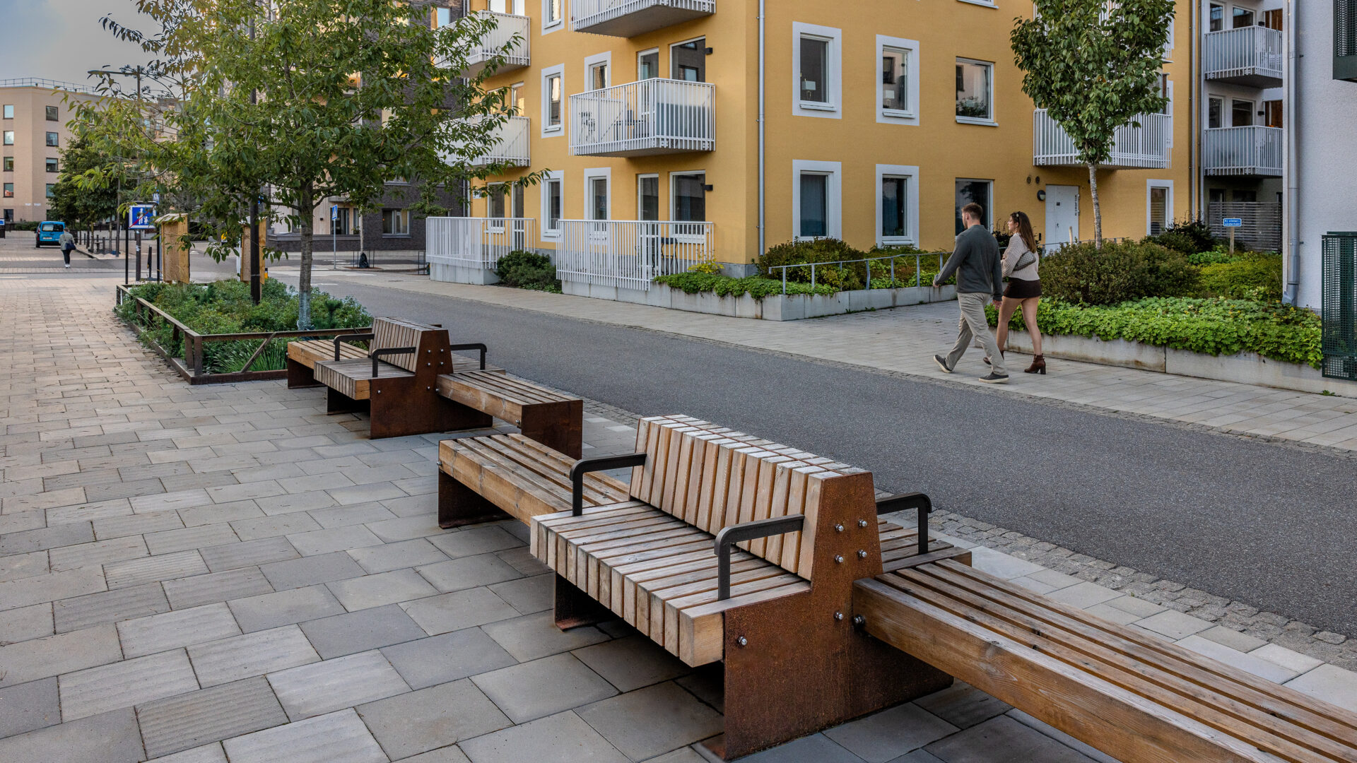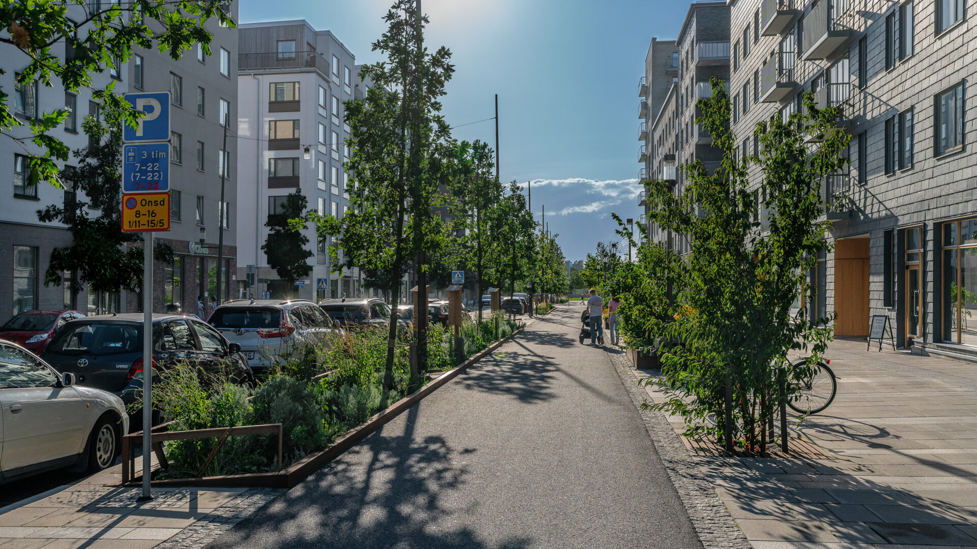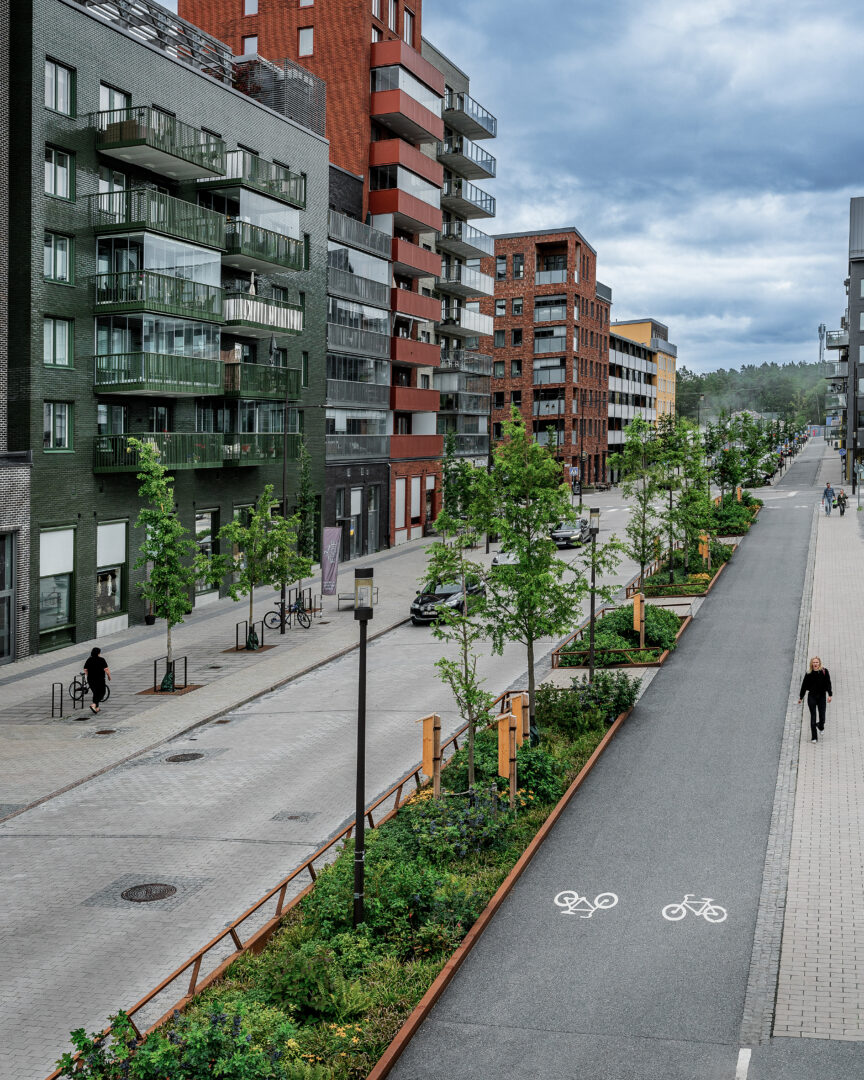 Stadsdelen prioriterar gående och cyklister, vilket genomsyrar gaturummens utformning. Grönytorna bidrar till att skapa skyddade, bilfria ytor för rörelse och innehåller ombonade ytor för vistelse och möten i vardagen. Gatorna präglas av omsorgsfullt utformade detaljer och materialval och innehåller flera egenritade möbler.