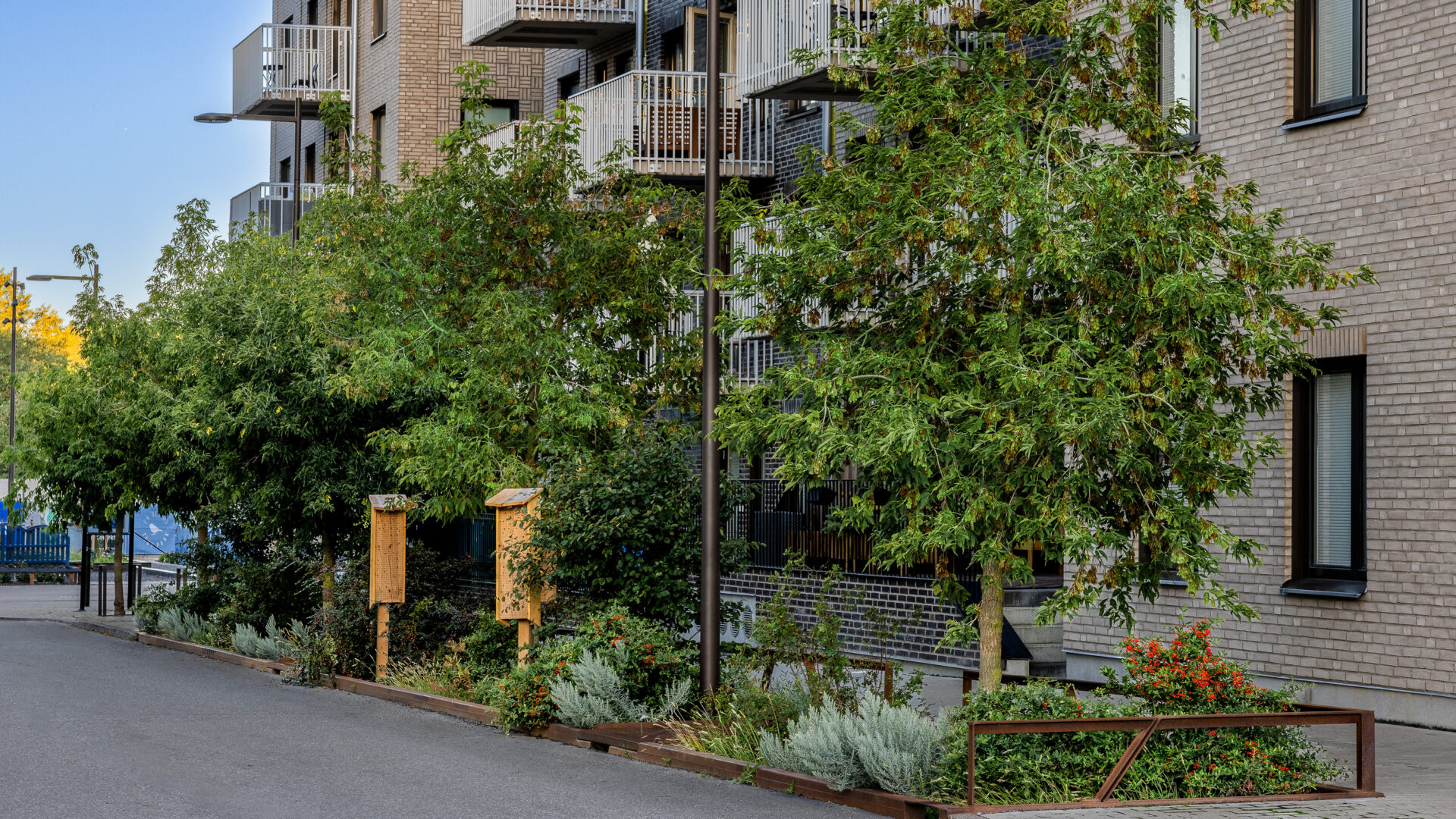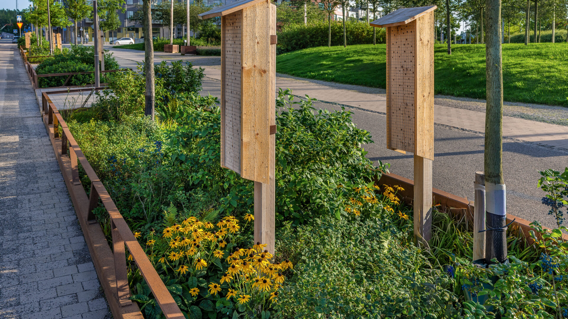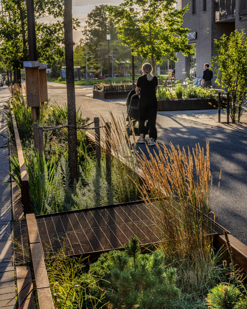 De grönskande regngårdarna ger en stark karaktär till gatorna med många träd, buskar och perenner. Trädvalet stärker gatornas identitet och varje gata planteras med en sorts trädart eller komposition av arter för att få ett eget uttryck samt bidra till ökad orienterbarhet inom området. Gatornas hierarki förstärks av trädens olika storlekar och variationen av träd ger ökad biologisk mångfald. Ett mål som har uppkommit under arbetet har varit att hälften ska utgöras av inhemskt växtmaterial. Växterna bidrar med upplevelsevärden som varierar över året med blomning, färgsprakande höstfärger, dekorativa stammar och vintergröna växter.