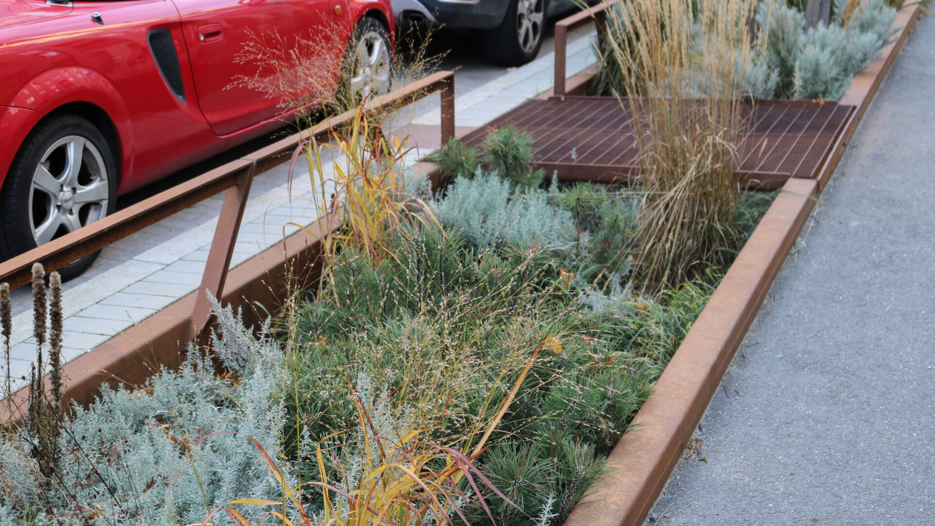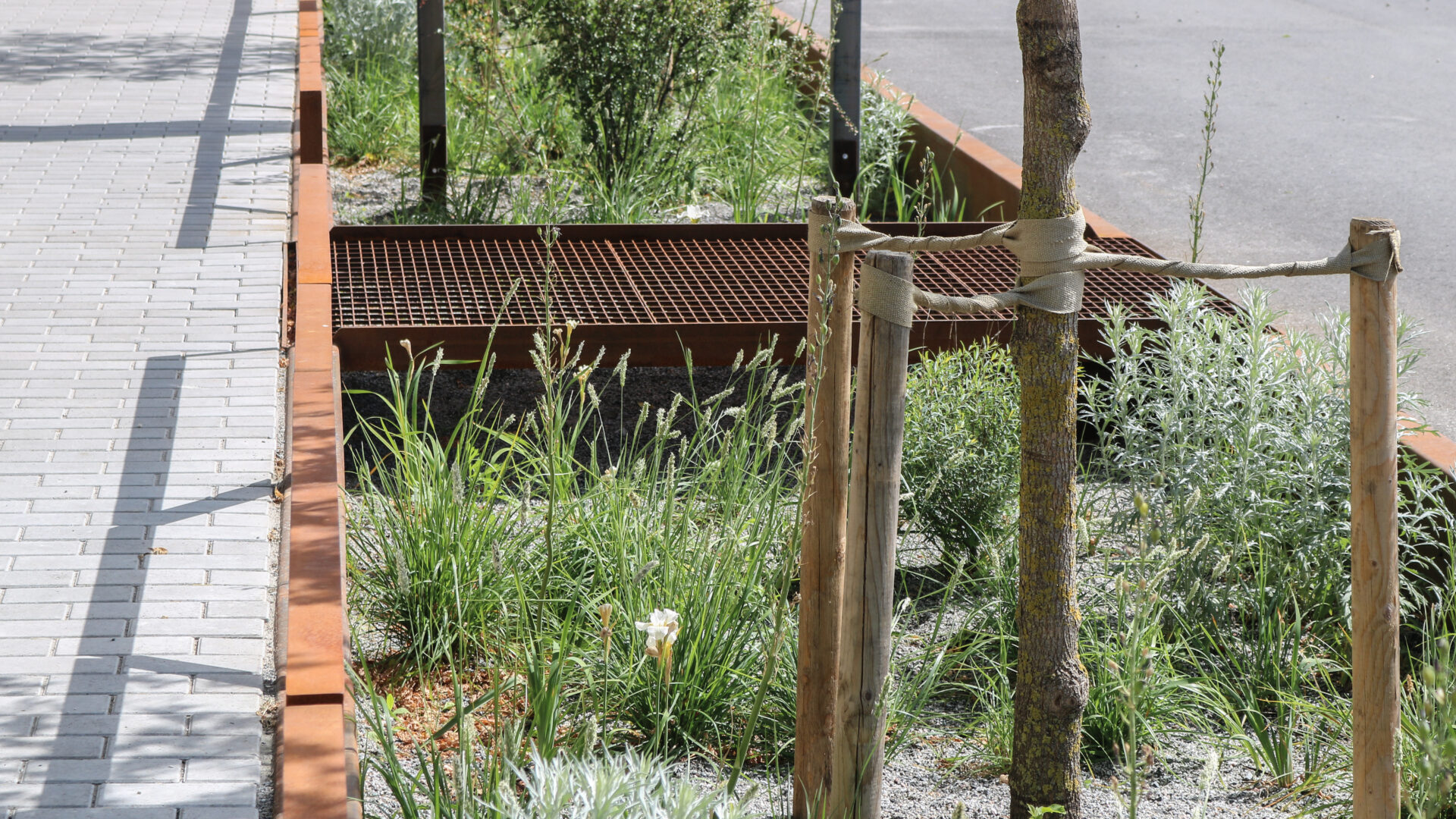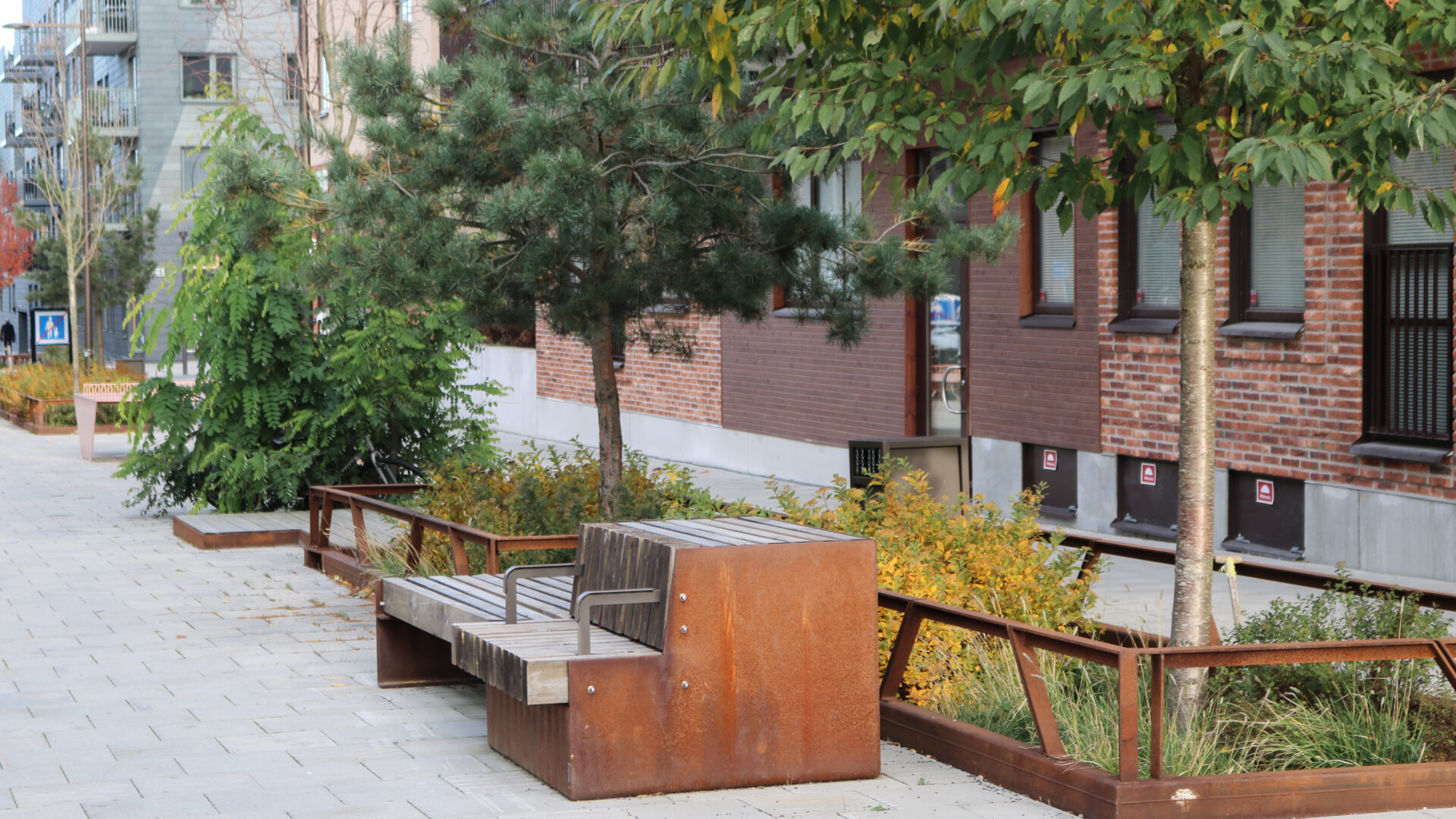 De grönskande regngårdarna ger en stark karaktär till gatorna med många träd, buskar och perenner. Trädvalet stärker gatornas identitet och varje gata planteras med en sorts trädart eller komposition av arter för att få ett eget uttryck samt bidra till ökad orienterbarhet inom området. Gatornas hierarki förstärks av trädens olika storlekar och variationen av träd ger ökad biologisk mångfald. Ett mål som har uppkommit under arbetet har varit att hälften ska utgöras av inhemskt växtmaterial. Växterna bidrar med upplevelsevärden som varierar över året med blomning, färgsprakande höstfärger, dekorativa stammar och vintergröna växter.