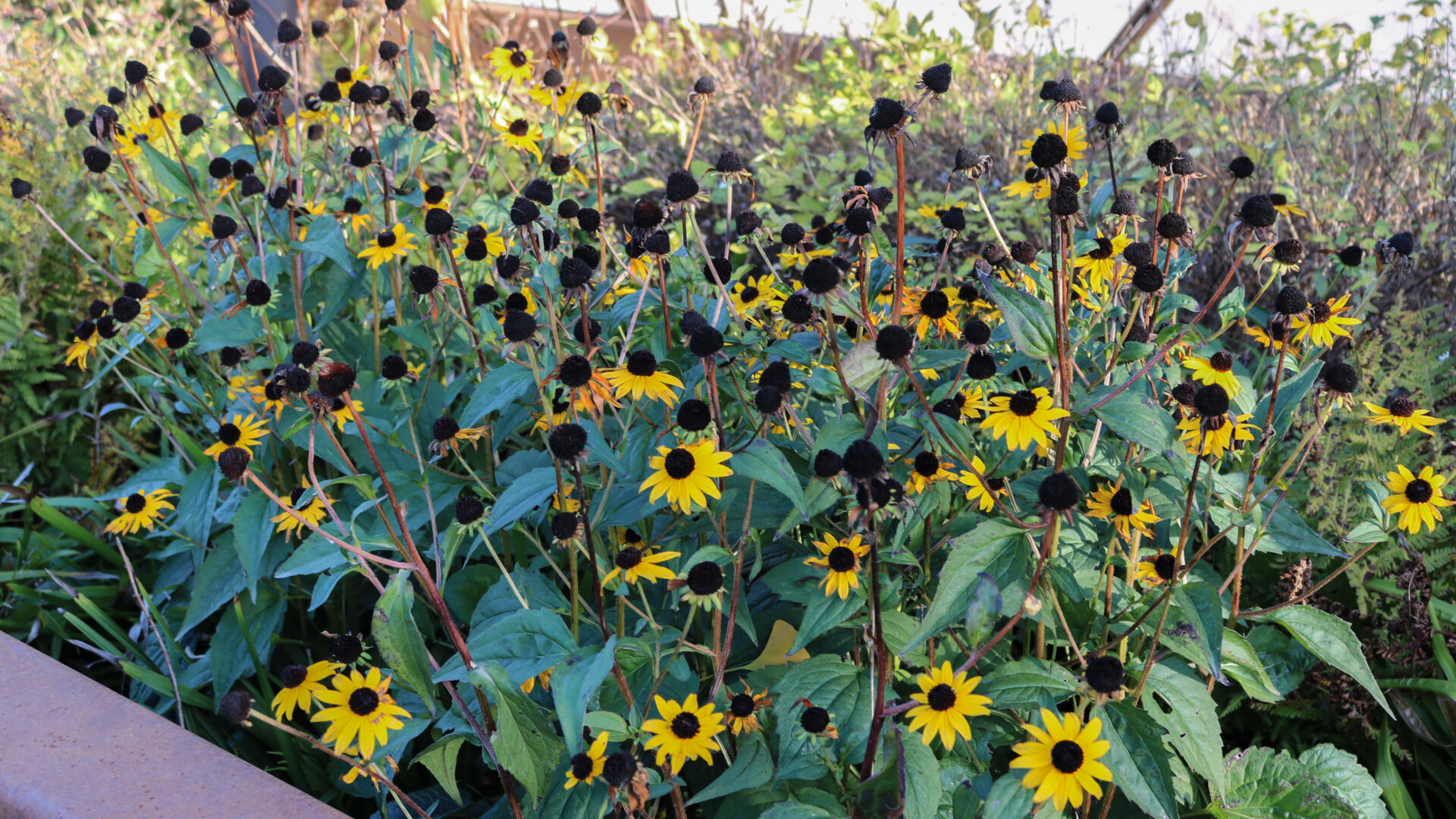 Ungersk ek med undervegetation av perenner, prydnadsgräs och buskar. Spängerna gör det möjligt att komma nära växterna.