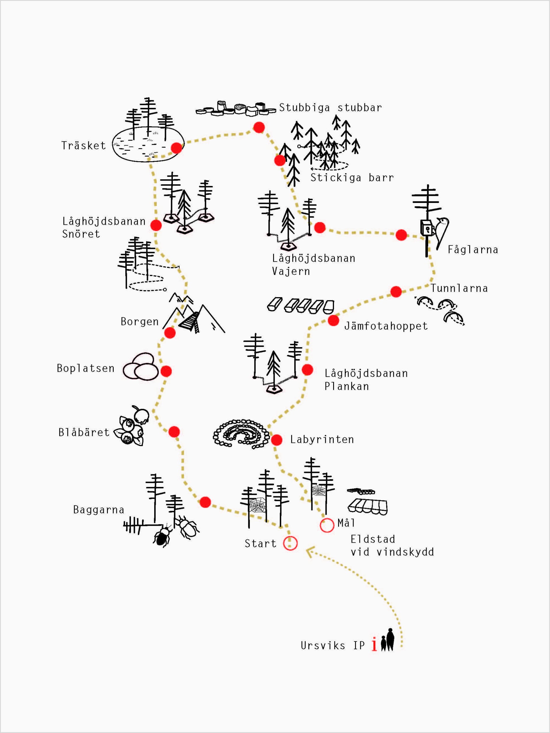 Illustrationen visar slingans rumsliga struktur, där platser och aktiviteter avlöser varandra i en sekvens av lek, rörelse och utforskande.