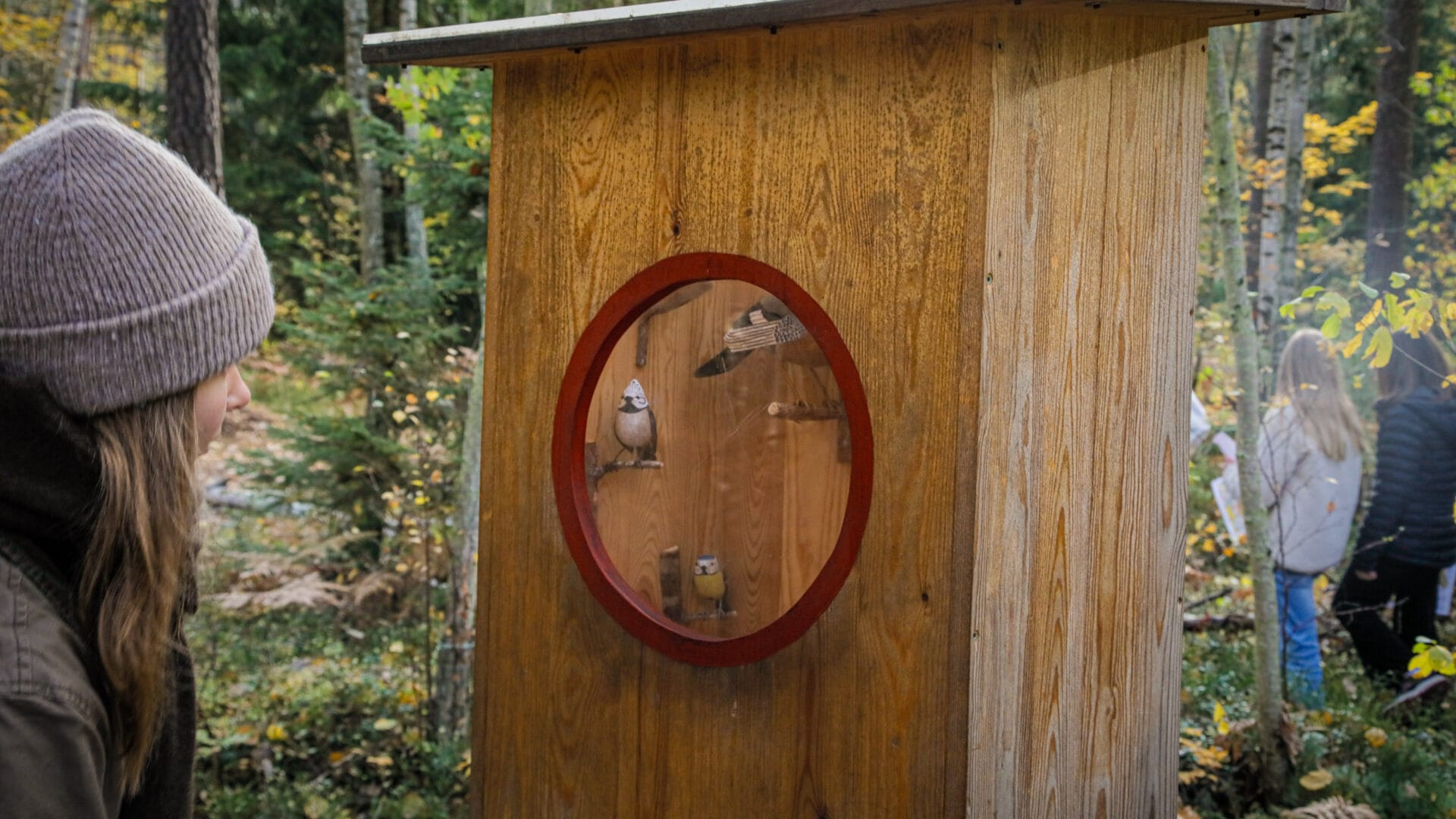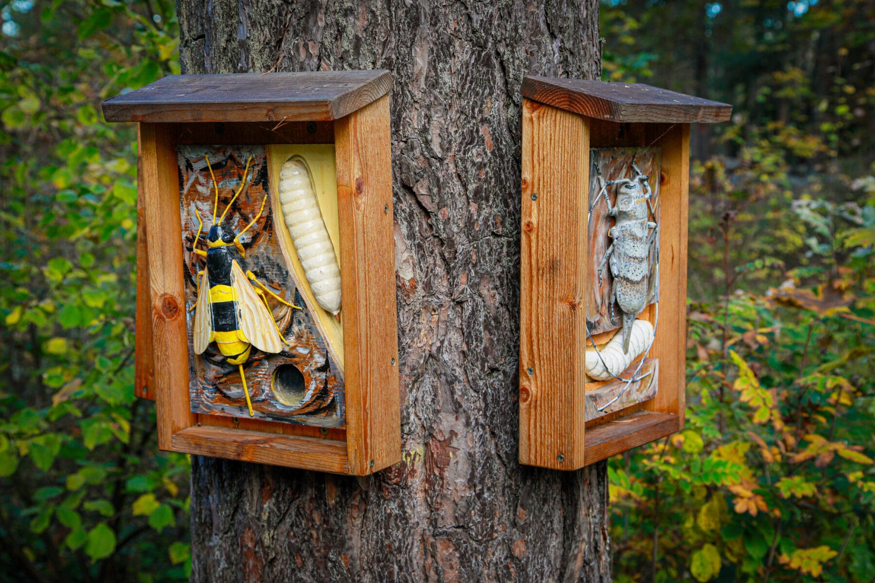 Pedagogisk utställning som visar insekters utveckling från ägg och larv till färdig insekt vilket väcker nyfikenhet för livet i naturen. Tillverkade av träsnidaren Vesa Jussila.