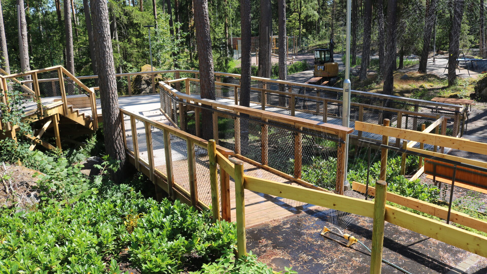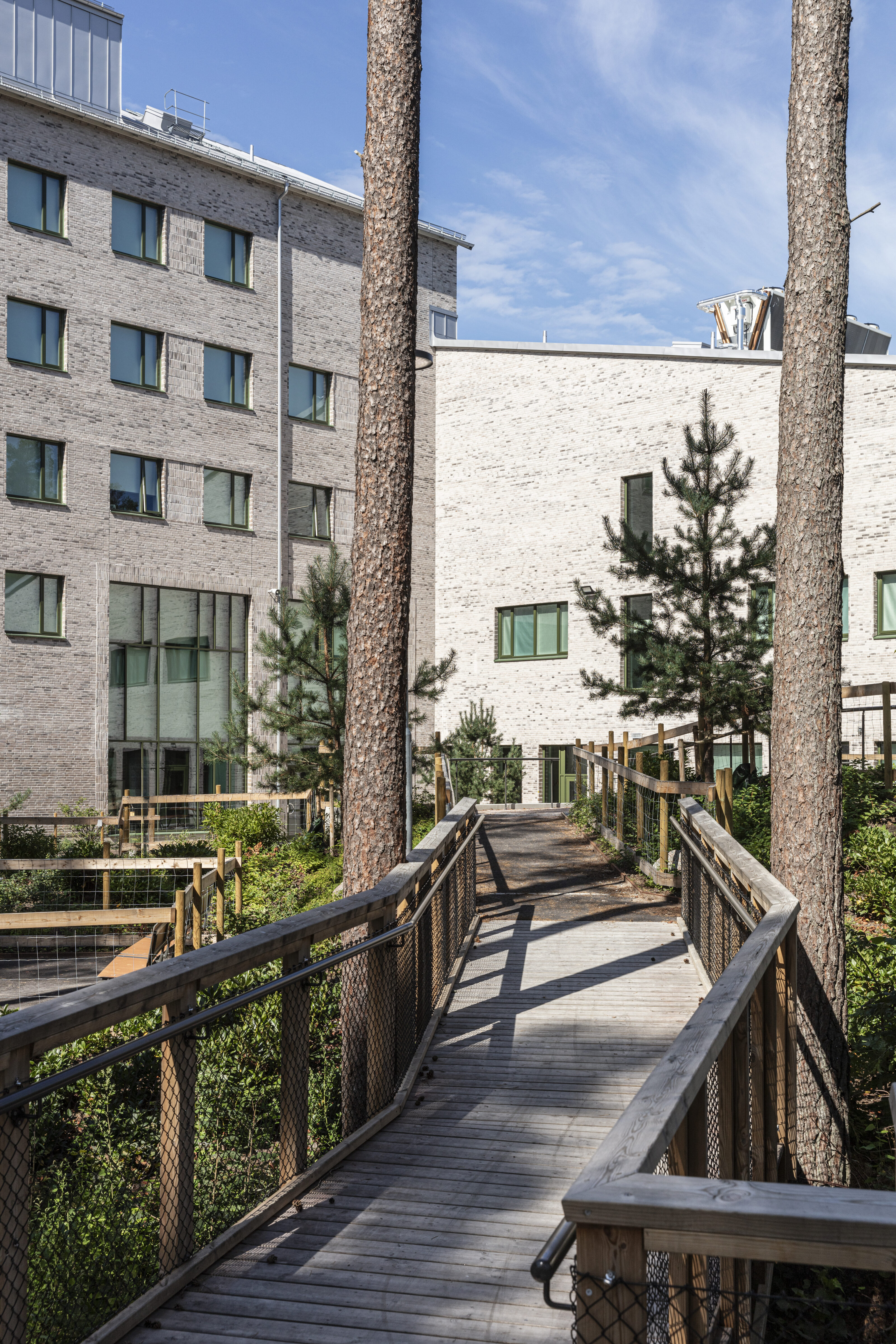 Stora delar av gården har orörd skog med befintliga tallar och berg i dagen. Via upphöjda träspänger kan barnen röra sig upp mot skogen och mellan tallarna.