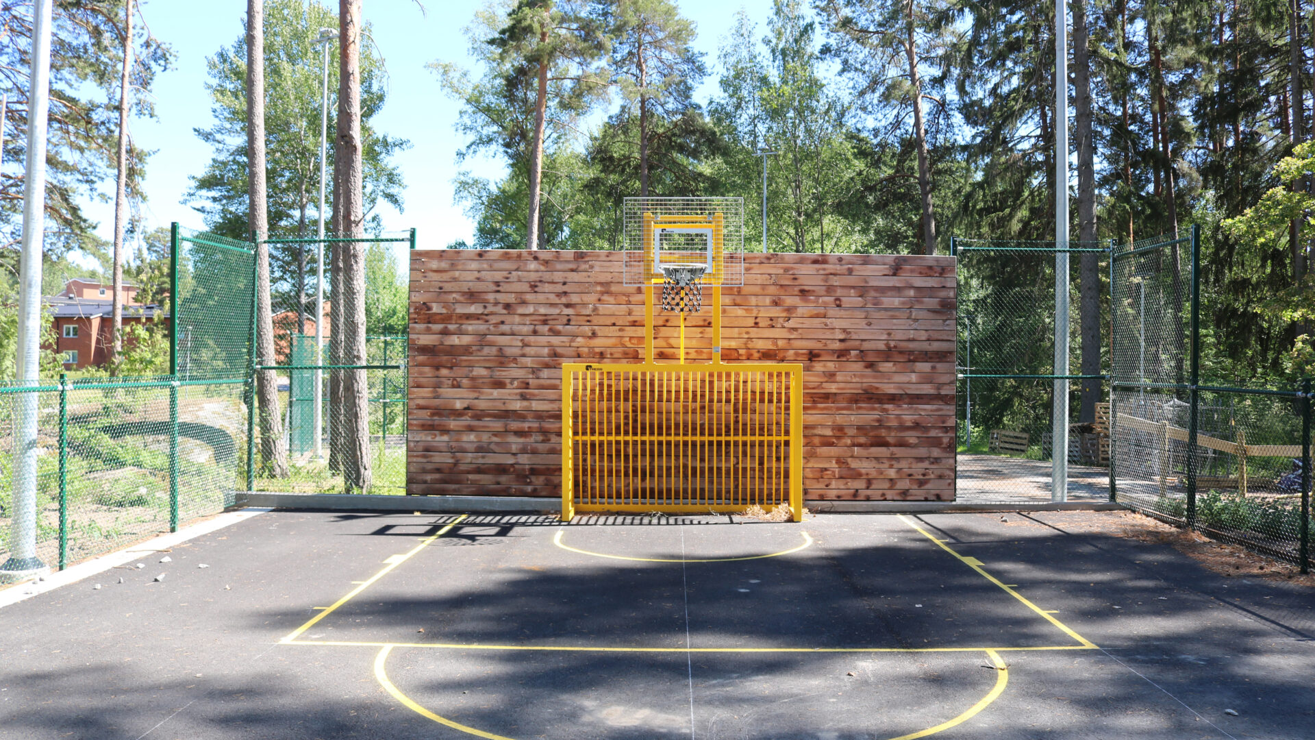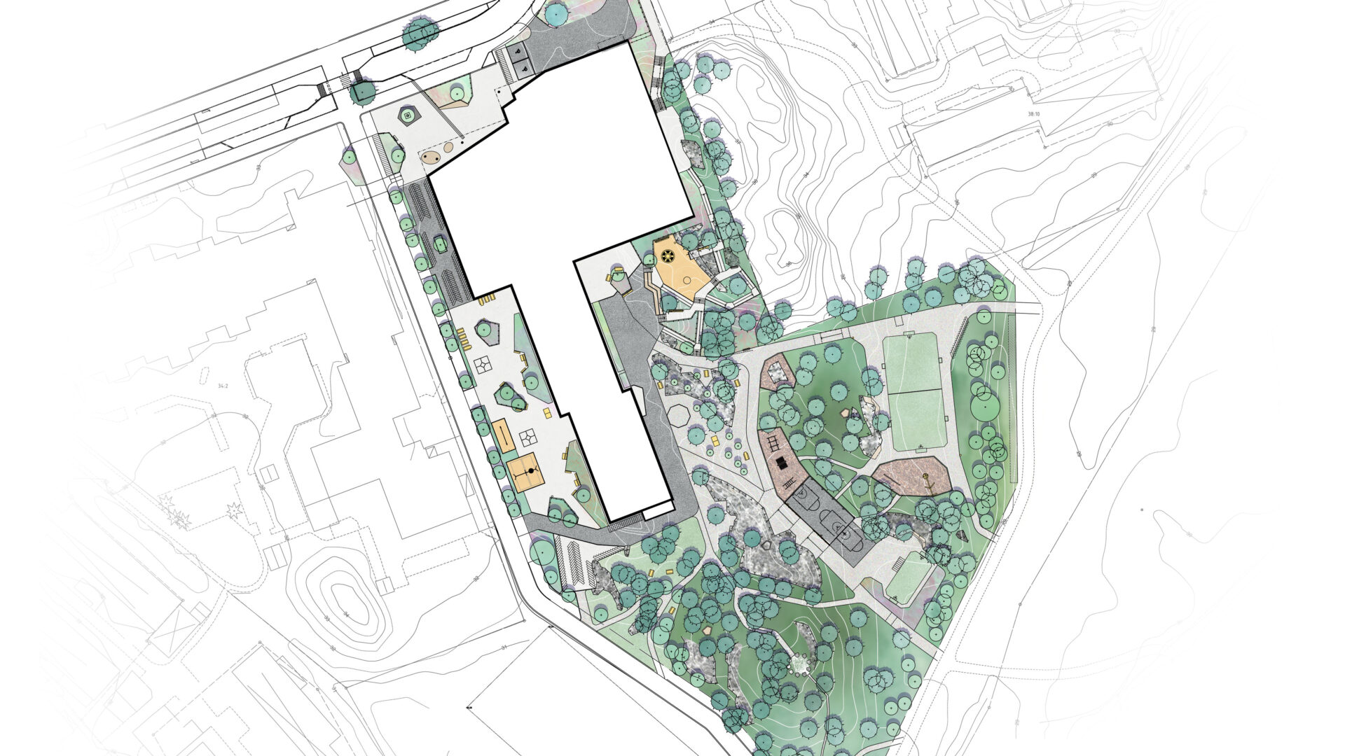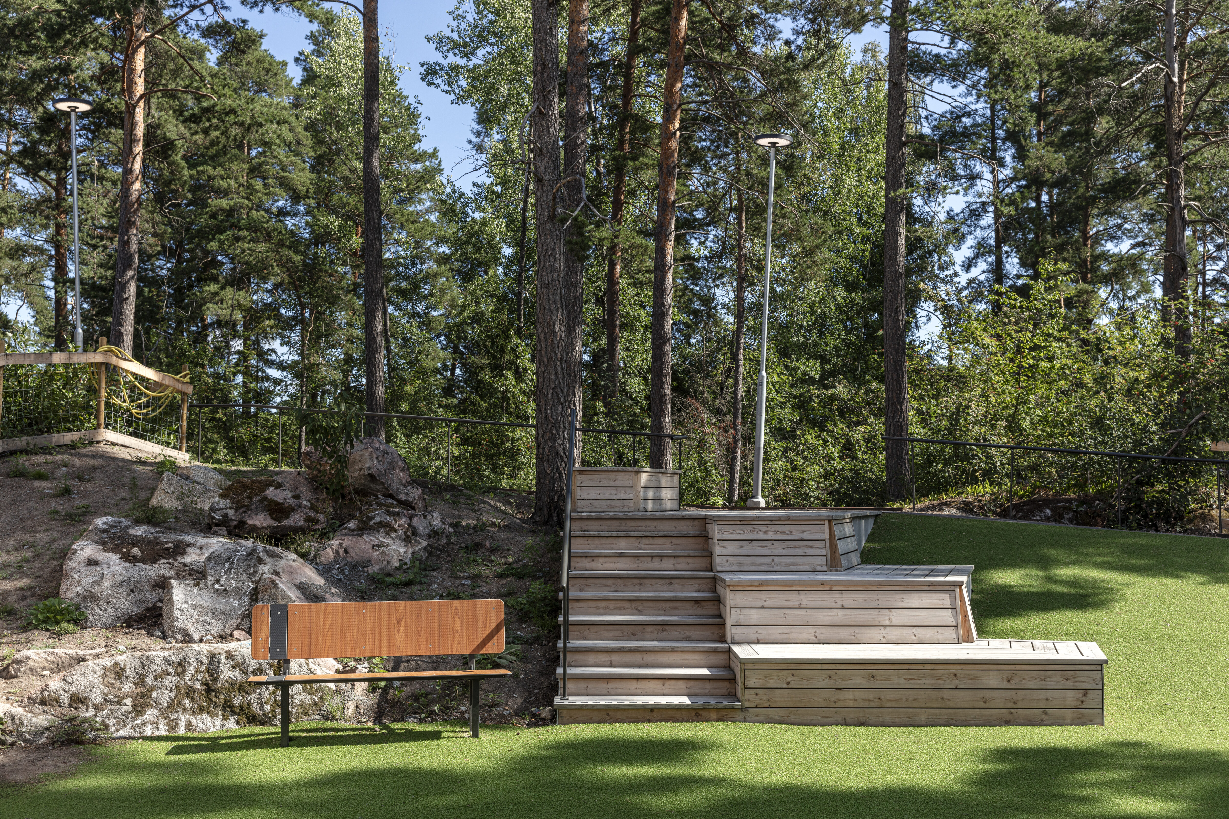 Skolan har en idrottsprofil för årskurs 6–9 och är placerad där staden möter skogen. Vi har låtit den orörda naturen med tallar och berg i dagen utgöra basen för skolgården. Genom att samla aktivitetsytorna i naturliga gläntor och flacka partier har vi kunnat bevara skogskänslan samtidigt som vi skapat plats för rörelse. Närmast byggnaden finns aktivitetsterrasser i flera nivåer där vi utnyttjat höjdskillnaderna för att skapa gradänger och sittplatser i bra sollägen.