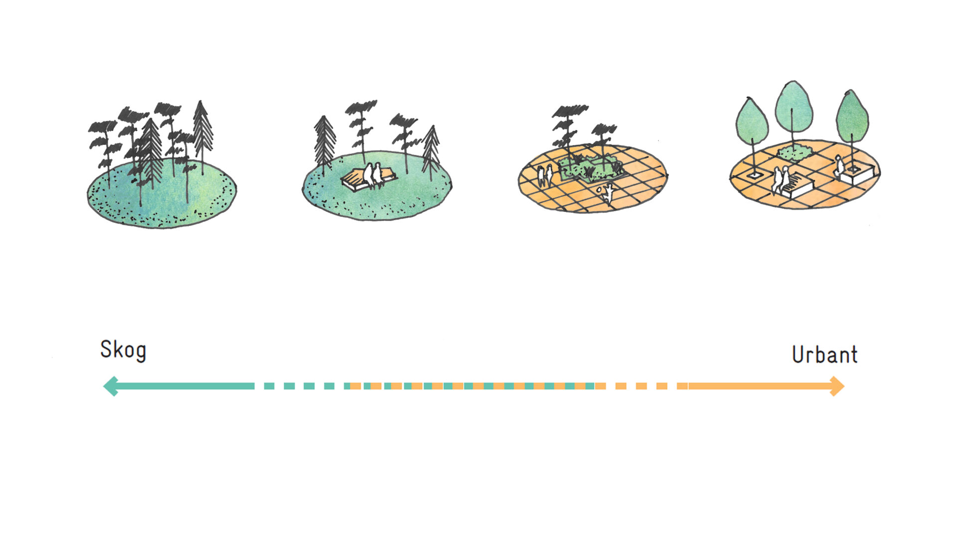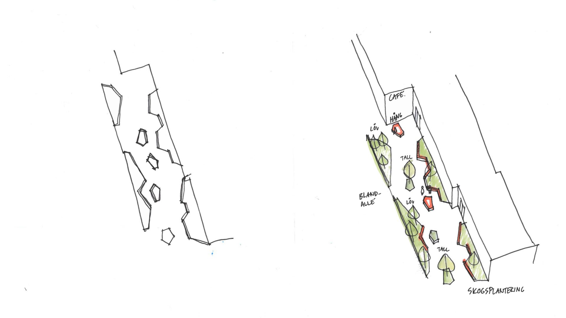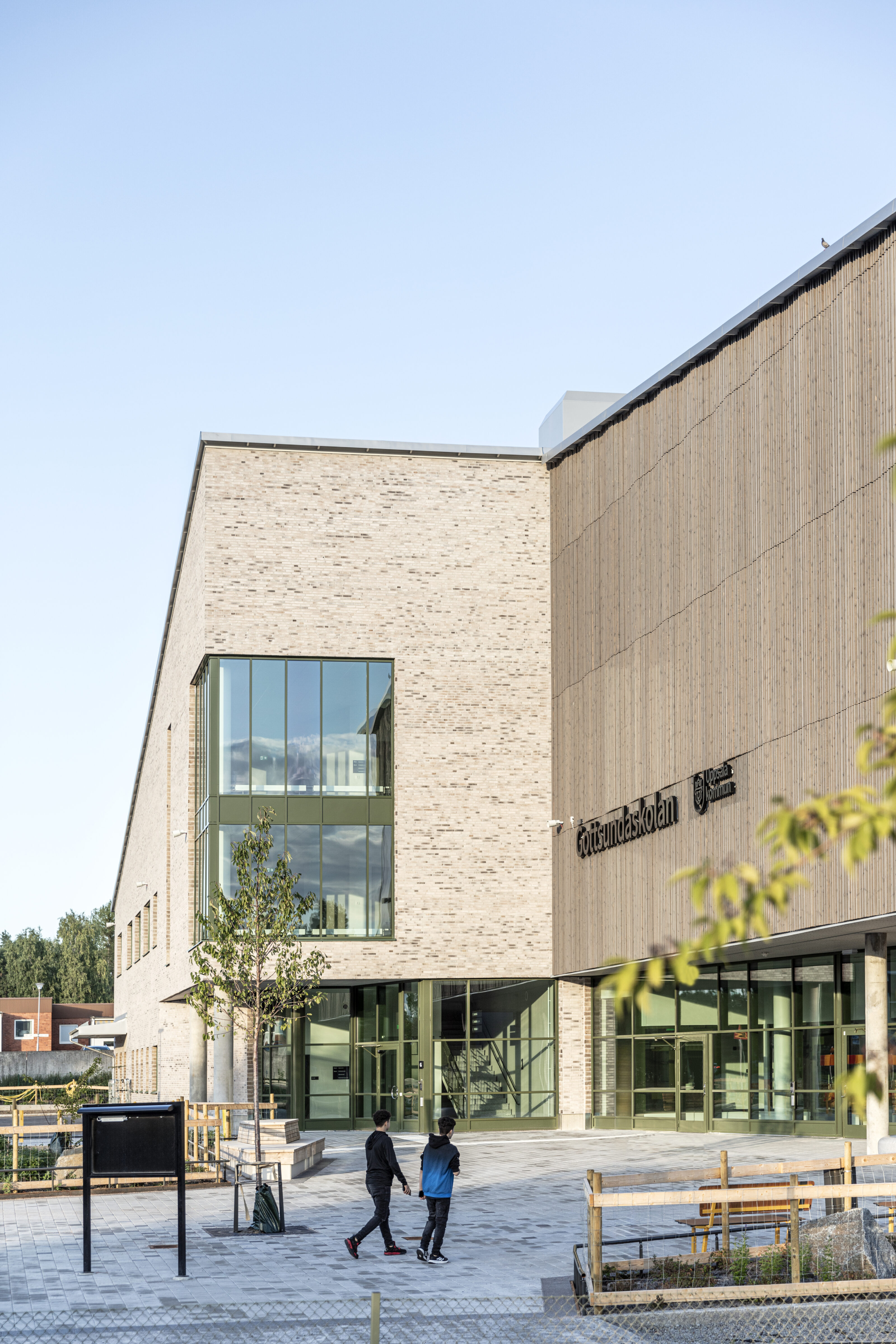 De mer urbana ytorna intill skolan är utformade med inspiration från den omgivande skogen. Vid entréerna har vi skapat välkomnande rum med stora planteringar som fungerar som en grön bas åt byggnaden. Nedsänkta växtbäddar delar in ytorna i mindre rum för både häng och fysisk aktivitet som pingis, gungor och balanslek. Vid huvudentrén möts eleverna av ett skoltorg med inramande grönska, stora sittmöbler och ett centralt vårdträd.