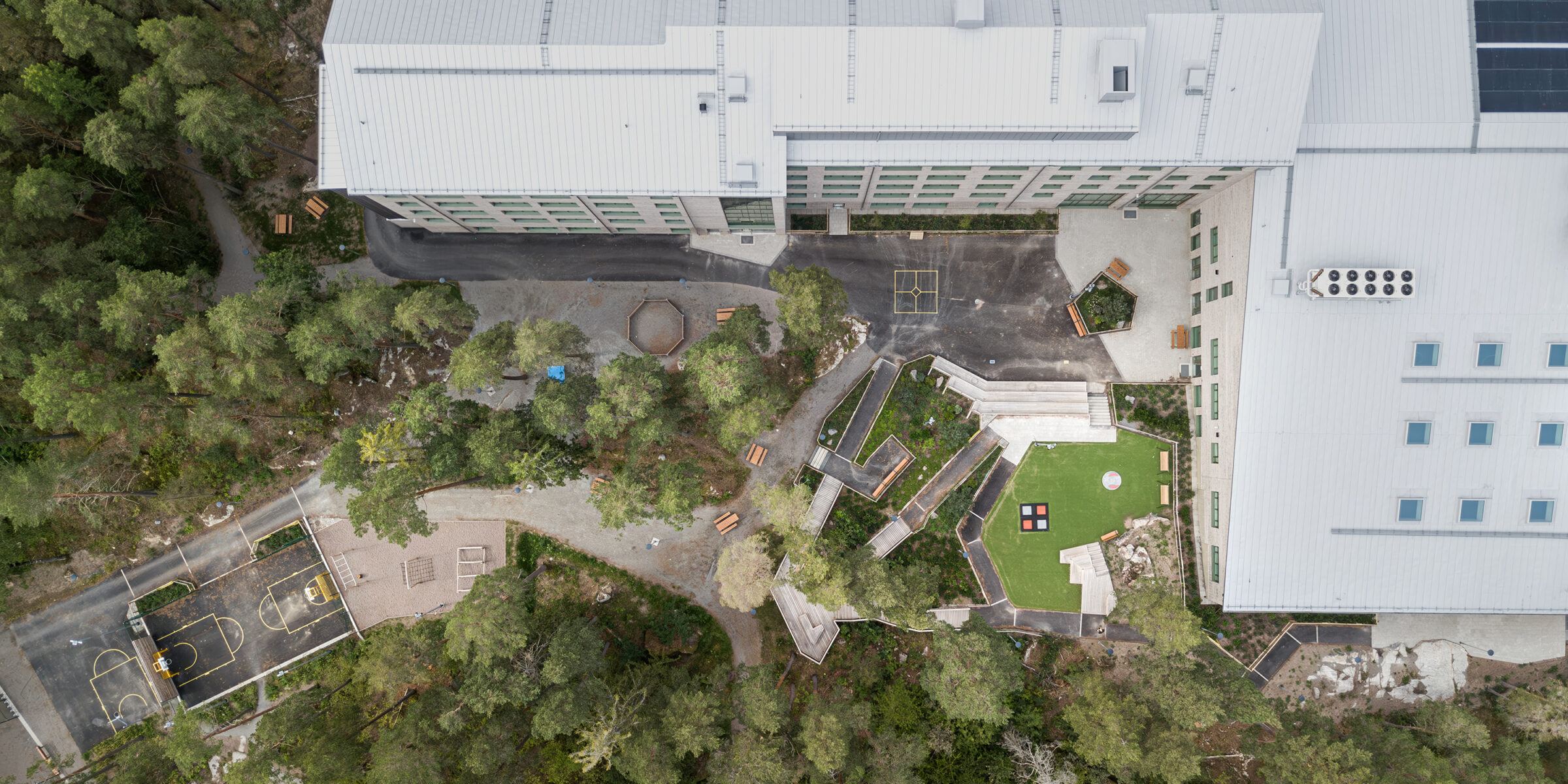 Skolan har en idrottsprofil för årskurs 6–9 och är placerad där staden möter skogen. Vi har låtit den orörda naturen med tallar och berg i dagen utgöra basen för skolgården. Genom att samla aktivitetsytorna i naturliga gläntor och flacka partier har vi kunnat bevara skogskänslan samtidigt som vi skapat plats för rörelse. Närmast byggnaden finns aktivitetsterrasser i flera nivåer där vi utnyttjat höjdskillnaderna för att skapa gradänger och sittplatser i bra sollägen.